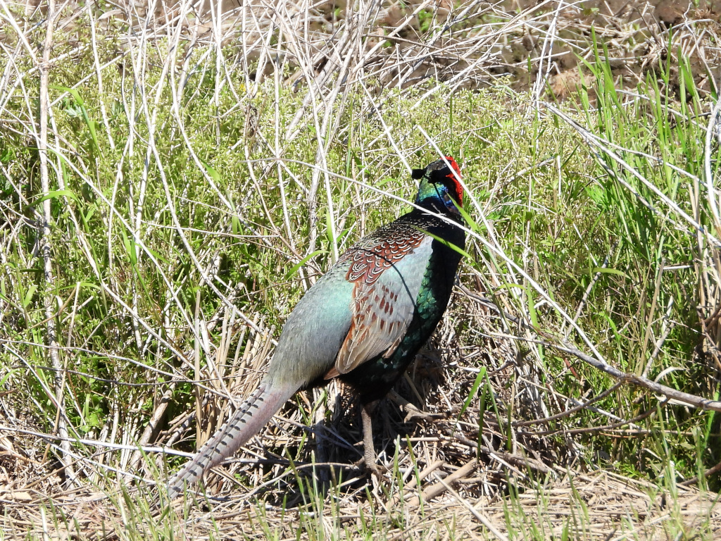 キジ君が田んぼを走り回っていました。田んぼの畔(あぜ)に出くわし、飛ぶか/戻るか迷っている様子でした。