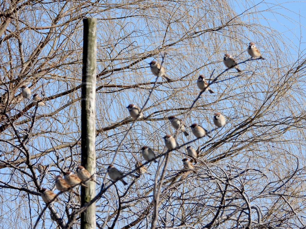 スズメは集団行動で自身を守っています。集まる時、逃げる時も集団で行います。上空にはトビが旋回していました。