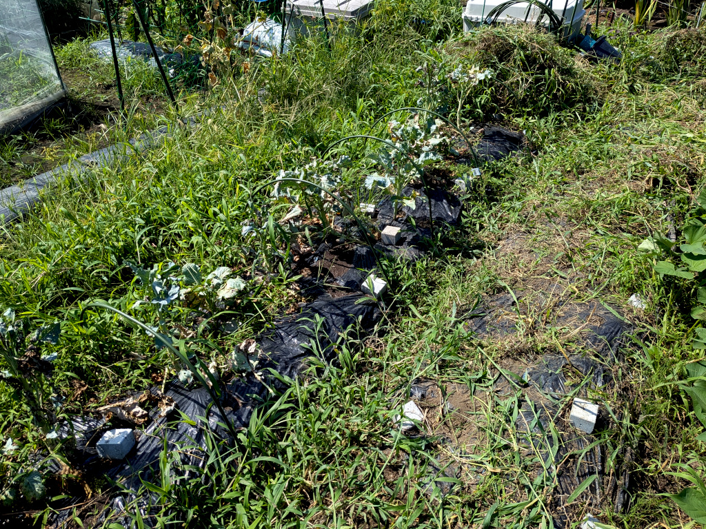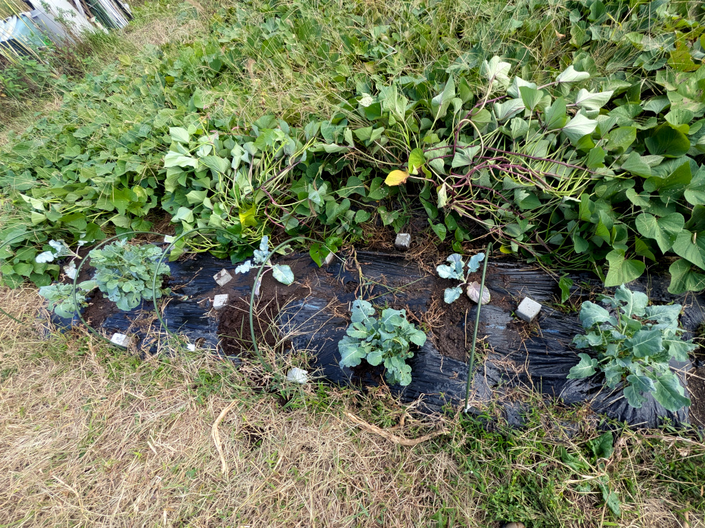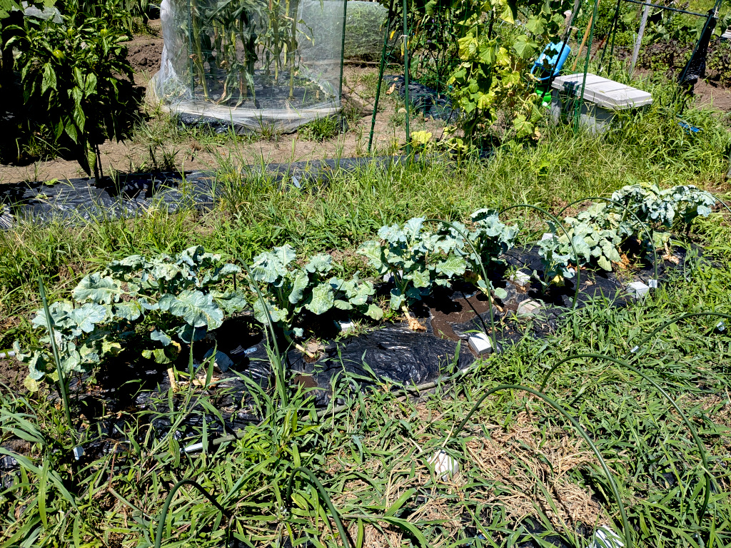 ブロッコリーとスティックセニョールの種を春にまきました。夏になるにしたがい両者は順調に成長しました。後者の株は背丈が伸び、防虫保護ネットに抑えられて曲がるようになって来たのでネットを取り除きました。また、ネットが紫外線などで劣化して2−3ヶ月も持たないこともこうした理由の1つです。