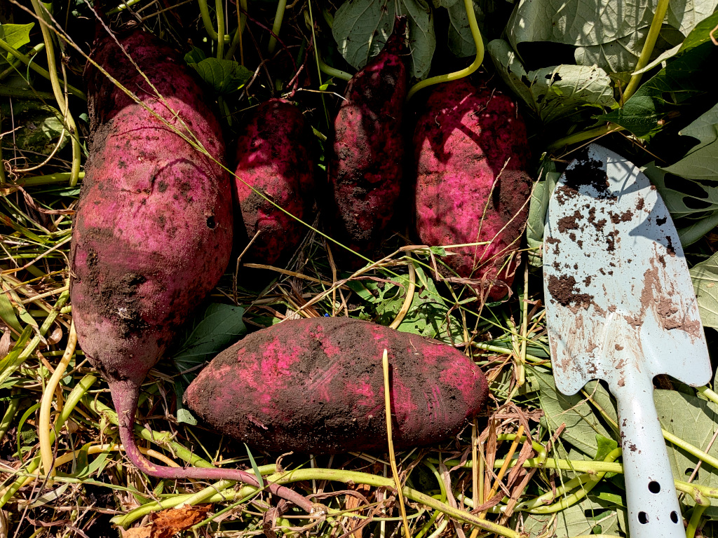 10月になったので、サツマイモの試し掘をしました。そうすると、1本の苗から5個の大きなサツマイモが採れました。草ぼうぼうの畑の中で育てた昨年のイモは細長く、数も少なく、今回のイモと比べると違いが一目瞭然です。調理の点では昨年度のイモの方が取り扱いやすいと思います。