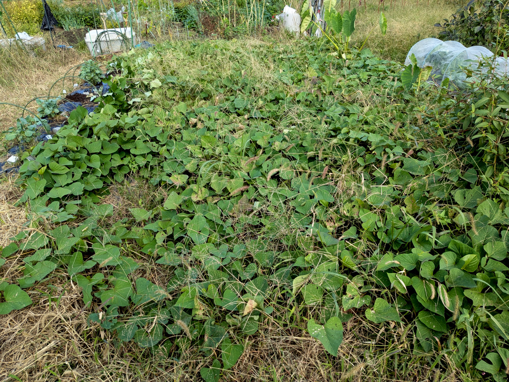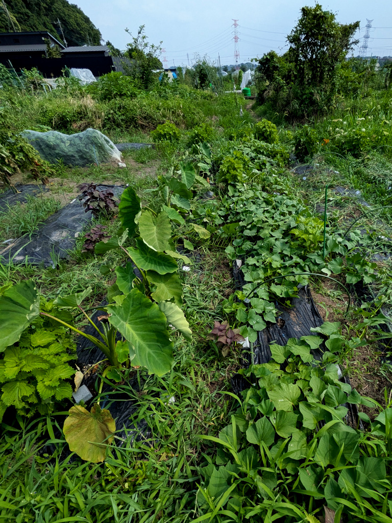 今年度は黒マルチシートと除草シートを活用し、雑草を一掃しました。その結果、40平方メートルの畑の一面がサツマイモの葉と弦で占領されてしまいました。畑の端に植えたサトイモだけが頭を出しています。